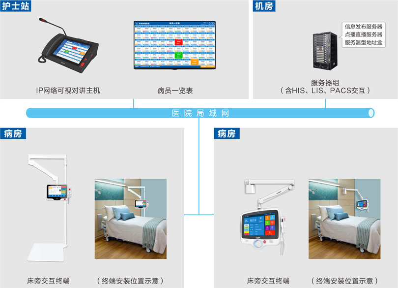 支持护士站主机、医生主机、床旁交互终端间的视频会诊。
