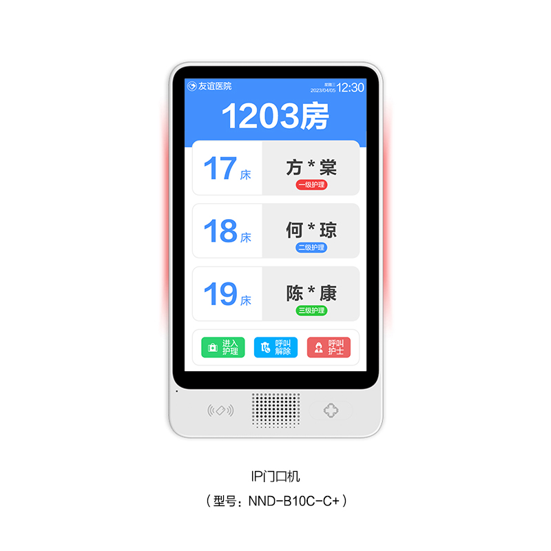 • 采用10.2英寸高清液晶显示屏,内置灯带双侧发光设计,壁挂式安装在病房门口。