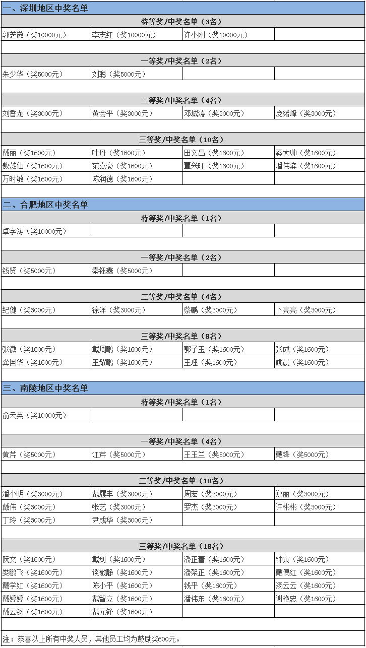 二等奖中奖员工(共18名,每人奖现金3000元):