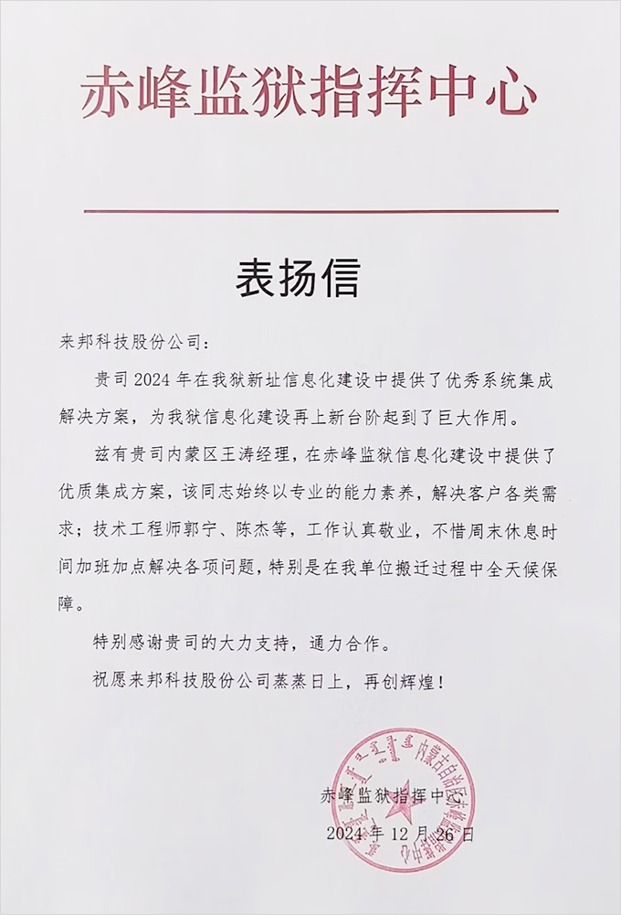 2024年12月26日,公司收到内蒙古赤峰监狱发来的表扬信,提到公司在该监狱新址信息化建设提供的优秀系统集成解决方案为监狱信息化建设再上新台阶起到了巨大作用,并对公司王涛经理专业的能力素养解决各类需求,以及技术工程师郭宁、陈杰等人的认真敬业、辛勤付出,予以表扬和感谢。