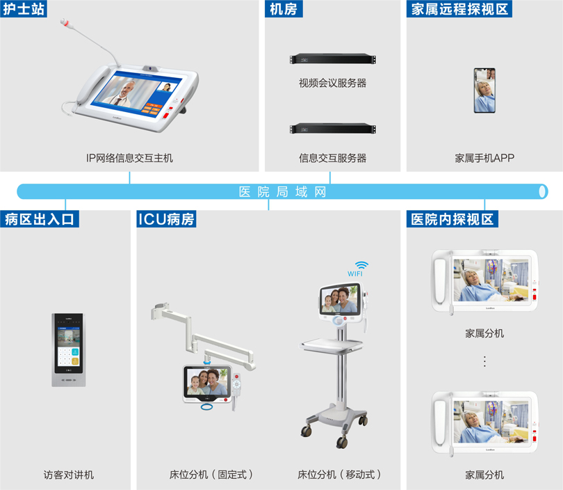 护士站主机、家属分机、病床分机之间可进行全双工高清可视对讲。