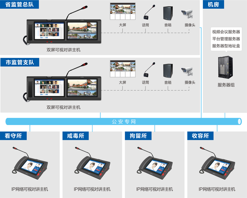 主机具有视频会议功能,省监管总队、市监管支队、监所单位均可召开或参与视频会议。