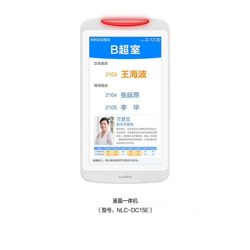 • 采用15.6英寸液晶显示屏,内置灯带双侧发光设计,壁挂式安装在检查室门口。
