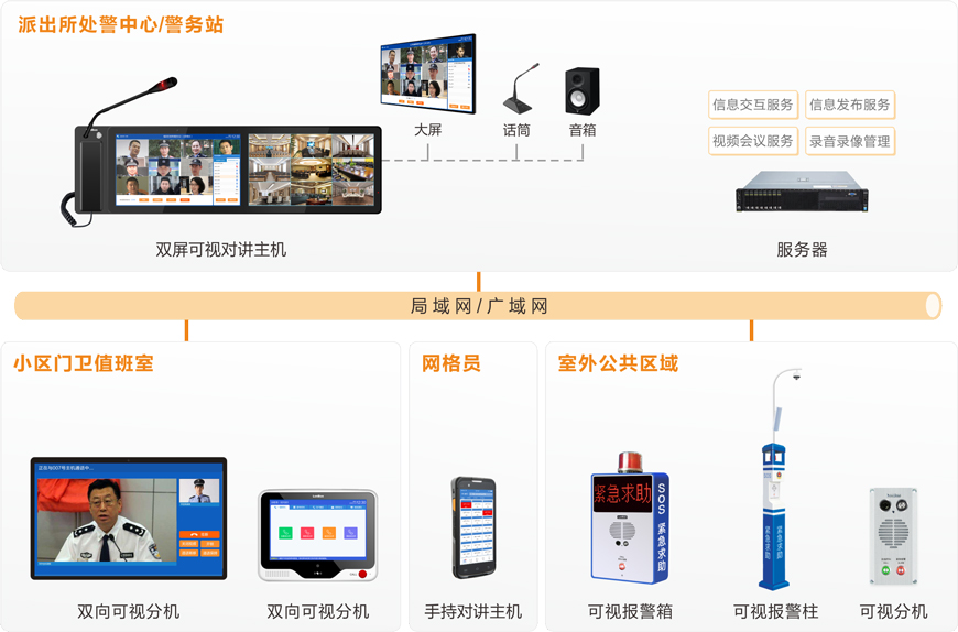 派出所要能快速便捷的与上级部门或其他职能部门可视对讲、视频会商等,达到协同处警的目的。