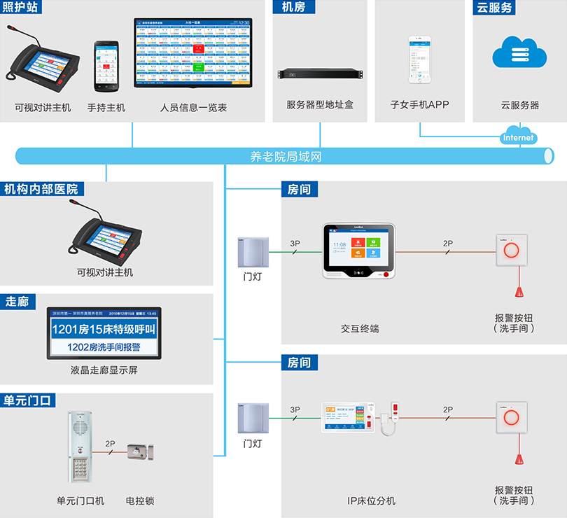 长者在床上感到不适,按下床头的SOS按键,照护站主机能立刻收到呼叫并伴有语音播报长者信息,护理员接听后可与长者建立通话。
