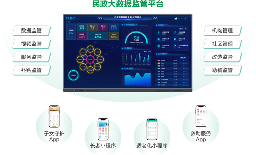 | 民政办 公室 | 民政监管数据 机构养老管理 社区养老管理 家庭床位管理 长者基础档案 助餐监管 改造管理 呼叫中心 信息发布 项目管理 | / | 套 | 1 | 含云服务(B/S架构), 支持多级架构。 |